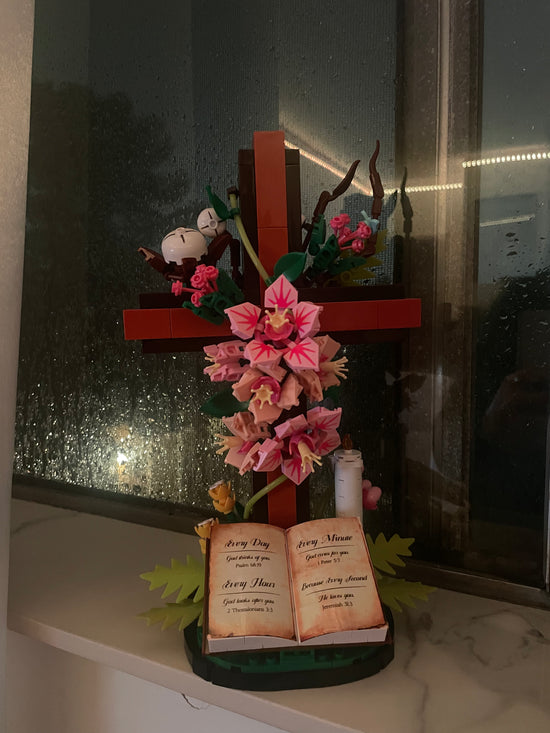 Mit den lebendigen Blumen, dem strahlenden Kreuz und der geöffneten Bibel wird dieses Set zu einem wunderschönen Blickfang für jedes Zuhause.